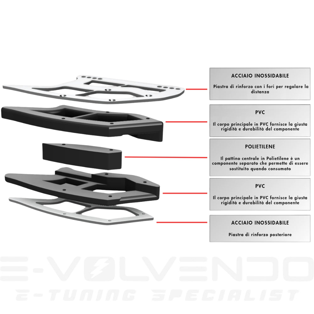 Corpo centrale in PVC, posizionato tra le staffe e lo slider, progettato per stabilizzare l’insieme e assorbire le sollecitazioni